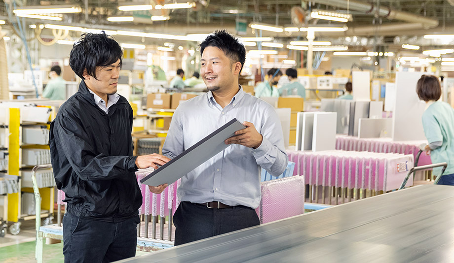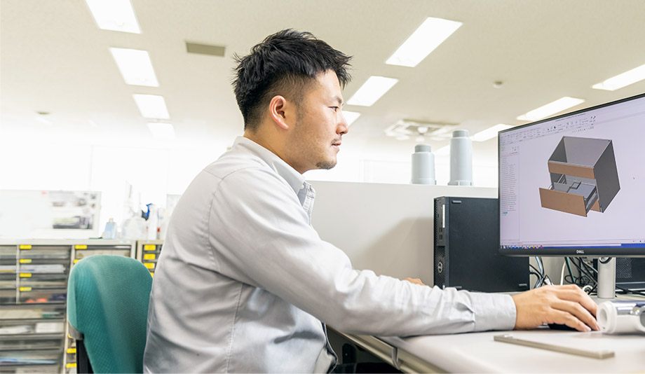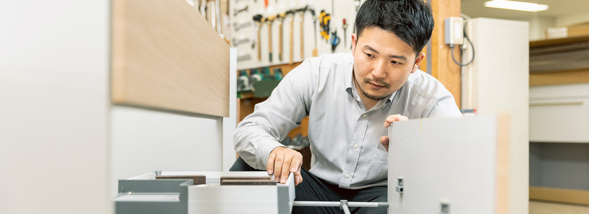 主に当社の主力分野であるシステムキッチンの新商品開発に携わっています。当社のキッチンは基本的には量産品なのですが、お客様のご要望に応じてカウンターのサイズ変更やキャビネットの組み合わせを選ぶことができるのが大きな特長です。そのため、同じものを大量に生産する一般的な量産品とは異なり、カスタマイズの自由度を考慮した設計が求められます。強度や部材同士の納まりなど苦労も多いですが、お客様のご要望に細やかに寄り添えるのがトクラスの大きな強みですので、排水系や機器の干渉、引き出しの構造などを吟味しながら、多彩なアレンジができるように工夫して量産仕様を作り込んでいます。同じ敷地内に工場がある強みを活かし、製造部門と密に連携しながら、使いやすく作りやすい商品設計を心掛けています。
