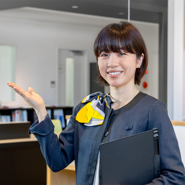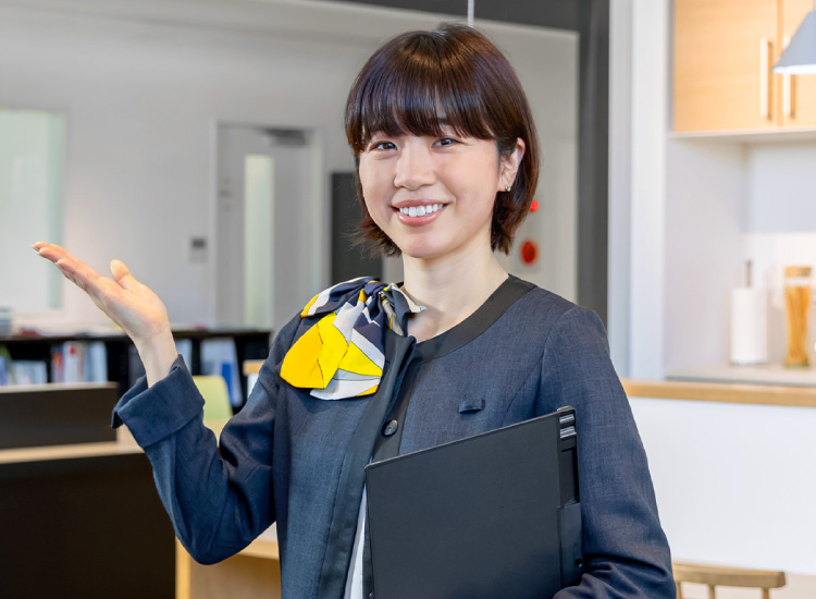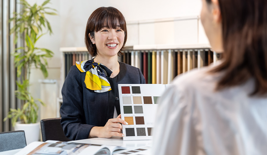 ショールームスタッフとして、お客様への商品説明や提案、見積書作成、ショールームの展示ディスプレイ管理などを担当しています。当社では、一度だけでなく二度三度と来場されるお客様も多いことから、じっくりとお話を伺いながら、本当のニーズを探っていくことができます。お客様のご要望だけでなく、家族構成や生活スタイルに寄り添った提案となるため、深い信頼関係を築ける点が魅力です。