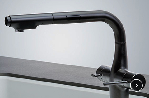 手をかざすだけで吐水操作ができるハンドセンサー付き水栓金具と浄水器の一体型なので、シンクまわりもスッキリ。